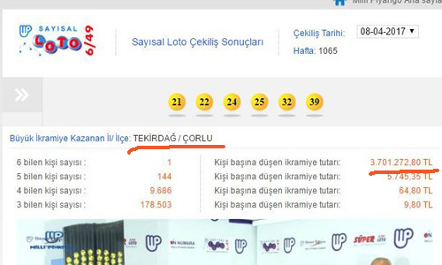 Sayısal bir hemşehrimizin yüzünü güldürdü Sayısal Loto’nun 8 Nisan 2017 çekilişinde büyük ikramiye Çorlu’ya isabet etti. Sayısal’da geçen hafta 6 bilen çıkmadığı için bu haftaya 1 milyon 737 bin 336 lira devretmişti. Bu haftaki katılımla birlikte 6 bilenin alacağı ikramiye 3 milyon 701 bin 272 liraya yükselmiş oldu. Bu para 8 Nisan günü yapılan çekiliş sonucu Çorlu’ya isabet etti. 21, 22, 24, 25, 32, 39 numaraları içeren kuponun sahibi olan hemşehrimiz 3 milyon 701 bin 272 lira 80 kuruş kazandı. |