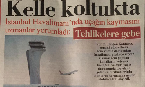 Cumhuriyet gazetesi, geçen hafta yağış nedeniyle bir uçağın pistte kayması üzerine konuyla ilgili olarak bilim insanlarının görüşlerini aldı. Prof. Dr. Doğan Kantarcı, Cumhuriyet’te yayımlanan açıklamasında yeni havalimanı pistinin askeri uzakların inip kalkabilecekleri nitelikte olduğunu belirterek şu bilgileri verdi: